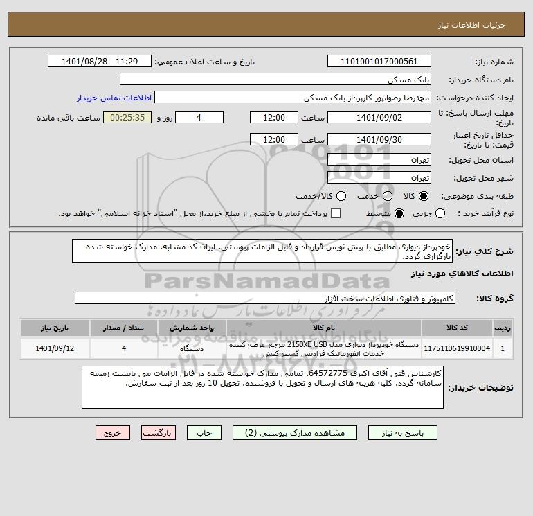 شرح کلی نیاز: خودپرداز دیواری مطابق با پیش نویس قرارداد و فایل الزامات پیوستی. ایران کد مشابه. مدارک خواسته شده بارگزاری گردد.