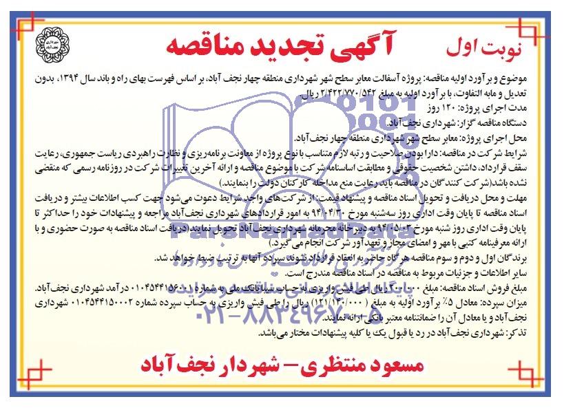موضوع و برآورد اولیه مناقصه: پروژه آسفالت معابر سطح شهر شهرداری منطقه چهار نجف آباد بر اساس فهرست بها راه و باند سال 94 بدون تعدیل و مابه التفاوت با برآورد اولیه به مبلغ 2.422.770.542 ریال