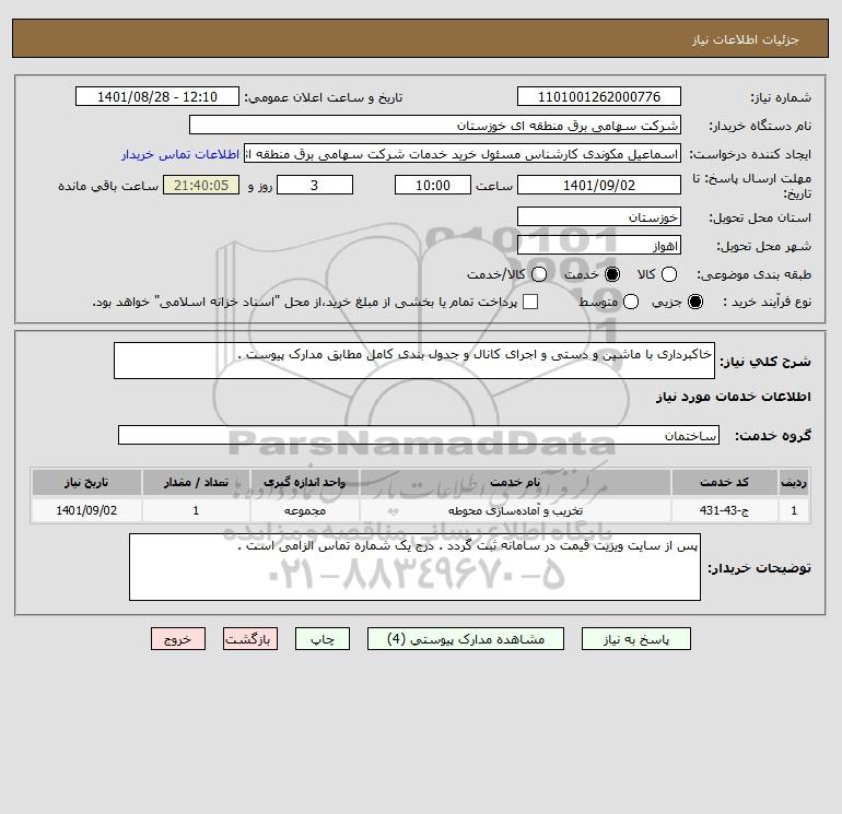 شرح کلی نیاز: خاکبرداری با ماشین و دستی و اجرای کانال و جدول بندی کامل مطابق مدارک پیوست .