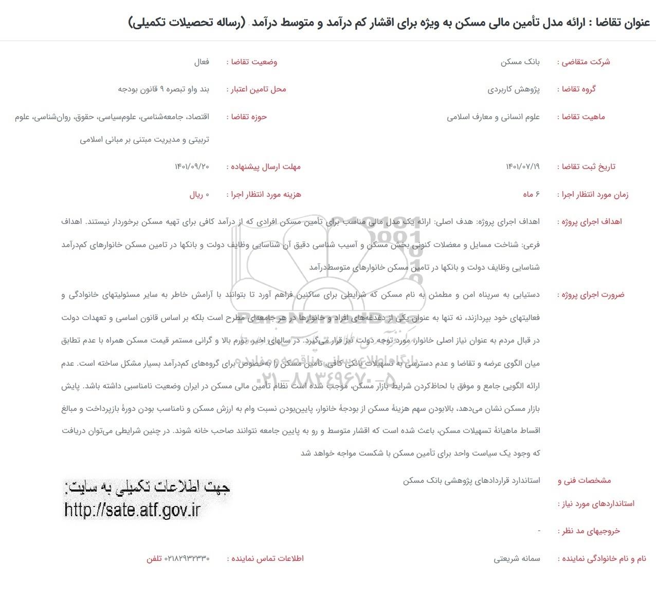فراخوان ارائه مدل تامین مالی مسکن به ویژه برای اقشار کم درآمد و متوسط درامد از کلیه افراد متخصص و شرکتها واجد شرایط دعوت به عمل میآید در مناقصه با کد خبرگزاری پارس نماد: 5167578 شرکت نمایند.