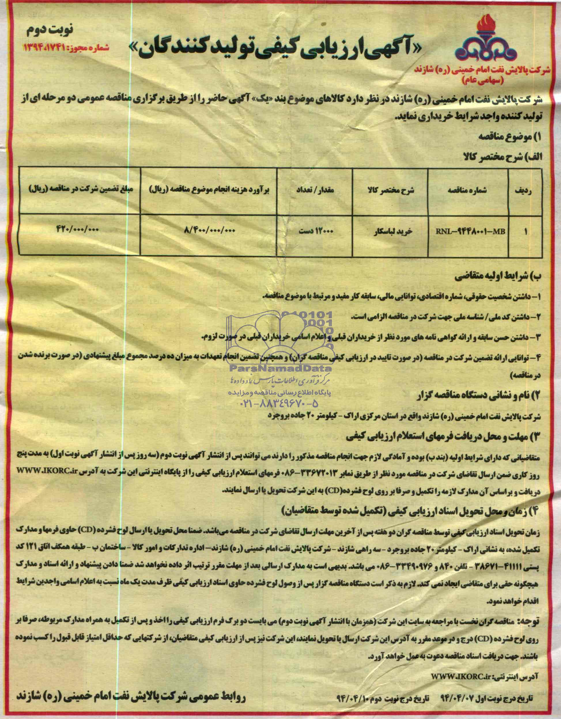 مناقصه عمومی دو مرحله ای خرید لباسکار از کلیه افراد متخصص و شرکتها واجد شرایط دعوت به عمل میآید در مناقصه با کد خبرگزاری پارس نماد: 516781 شرکت نمایند.
