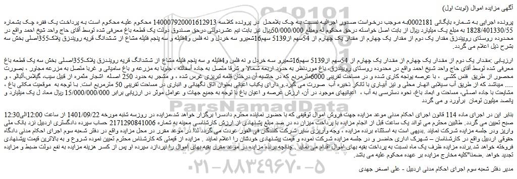 پرونده اجرایی به شماره بایگانی 0002181به موجب درخواست صدور اجرائیه نسبت به چک بلامحل در پرونده کلاسه 140007920001612913 محکوم علیه محکوم است به پرداخت یک فقره چک بشماره 1828/401330/55 به مبلغ یک میلیارد ریال از بابت اصل خواسته درحق محکوم له ومبلغ 50/000/000ریال نیز بابت نیم عشردولتی درحق صندوق دولت یک قطعه باغ معرفی شده توسط آقای حاج واحد شیخ احمد واقع در محدوده روستای روییندزق مقدار یک دوم از مقدار یک چهارم از مقدار یک چهارم از 54سهم از5139 سهم16شعیرو سه خردل و نه فلس و4فتیله و سه پنجم فتیله مشاع از ششدانگ قریه رویندزق پلاک355اصلی بخش سه بشرح ذیل اعلام می گردد.