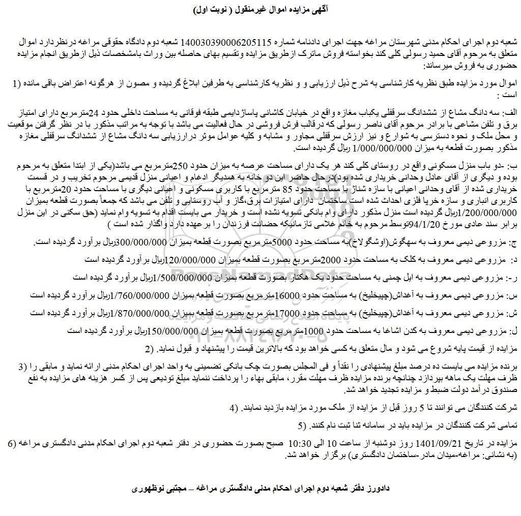 شعبه دوم اجرای احکام مدنی شهرستان مراغه جهت اجرای دادنامه شماره 140030390006205115 شعبه دوم دادگاه حقوقی مراغه درنظردارد اموال متعلق به مرحوم آقای حمید رسولی کلی کند بخواسته فروش ماترک ازطریق مزایده وتقسیم بهای حاصله بین وراث بامشخصات ذیل ازطریق انجام مزایده حضوری به فروش میرساند: