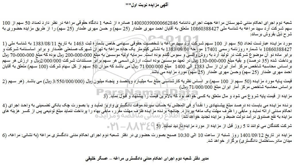 شعبه دوم اجرای احکام مدنی شهرستان مراغه جهت اجرای دادنامه 140030390000662846 صادره از شعبه 1 دادگاه حقوقی مراغه در نظر دارد تعداد 50 سهم از 100 سهم شرکت آرد سپید مراغه به شناسه ملی 10860388427 متعلق به آقایان احمد مهری علمدار (25 سهم) و حسن مهری علمدار (25 سهم) را از طریق مزایده حضوری به شرح ذیل بفروش برساند: