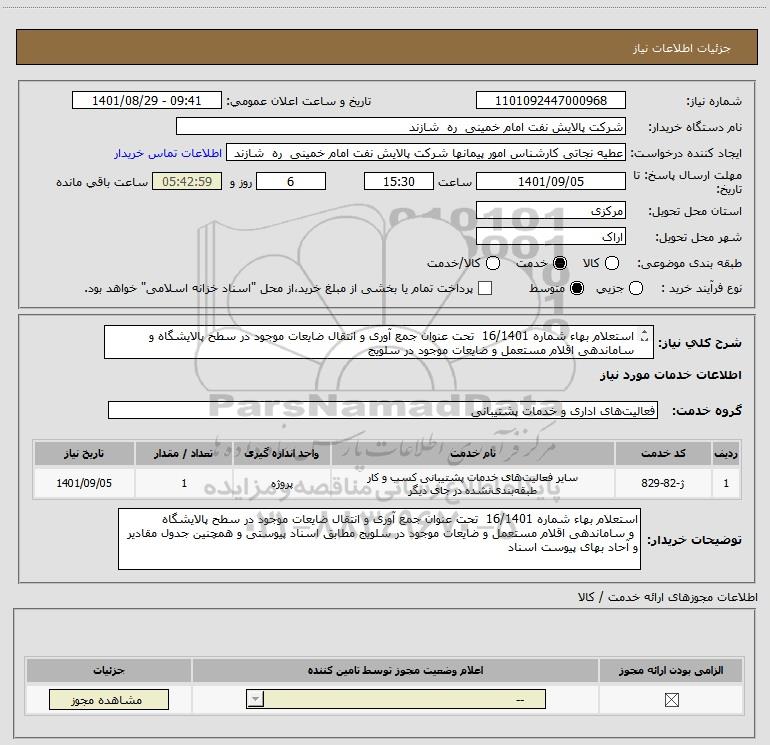 شرح کلی نیاز: استعلام بهاء شماره 16/1401 تحت عنوان جمع آوری و انتقال ضایعات موجود در سطح پالایشگاه و ساماندهی اقلام مستعمل و ضایعات موجود در سلویج