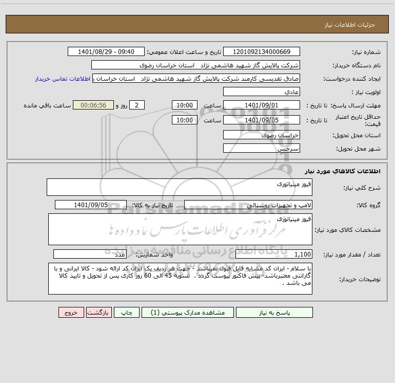 نام دستگاه خریدار:شرکت پالایش گاز شهید هاشمی نژاد استان خراسان رضوی