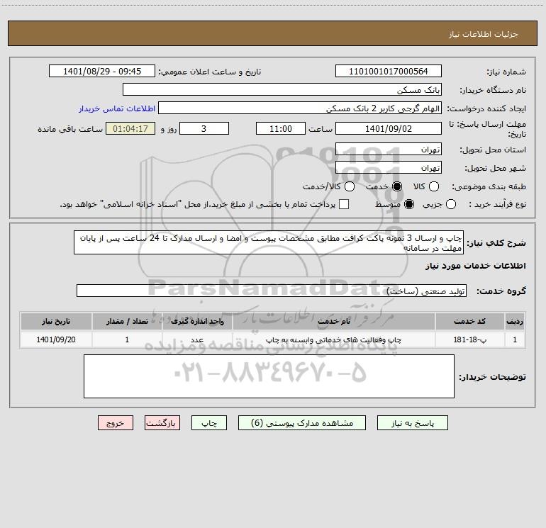 شرح کلی نیاز: چاپ و ارسال 3 نمونه پاکت کرافت مطابق مشخصات پیوست و امضا و ارسال مدارک تا 24 ساعت پس از پایان مهلت در سامانه