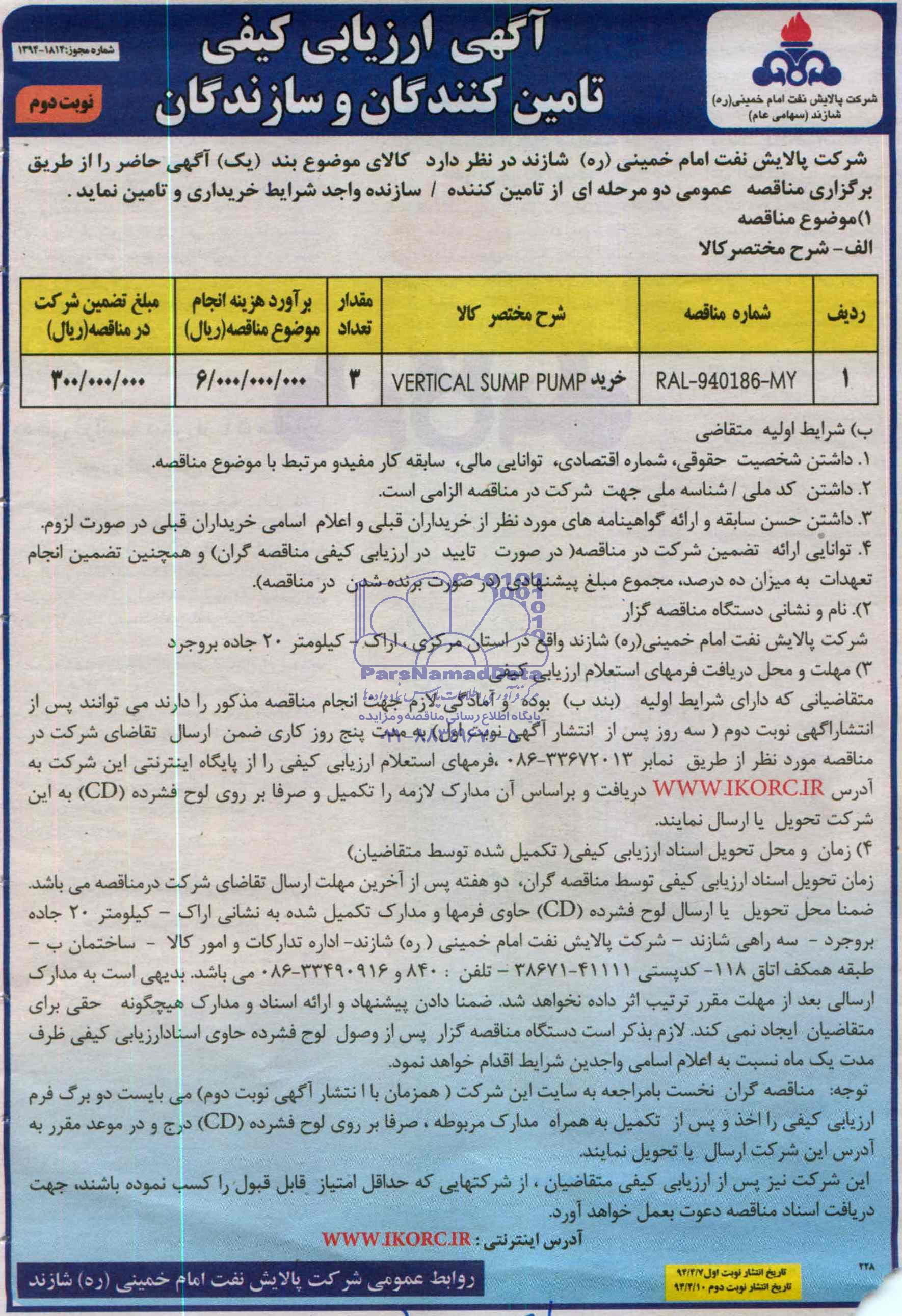 مناقصه خرید VERTICAL SUMP PUMP از کلیه افراد متخصص و شرکتها واجد شرایط دعوت به عمل میآید در مناقصه با کد خبرگزاری پارس نماد: 517067 شرکت نمایند.