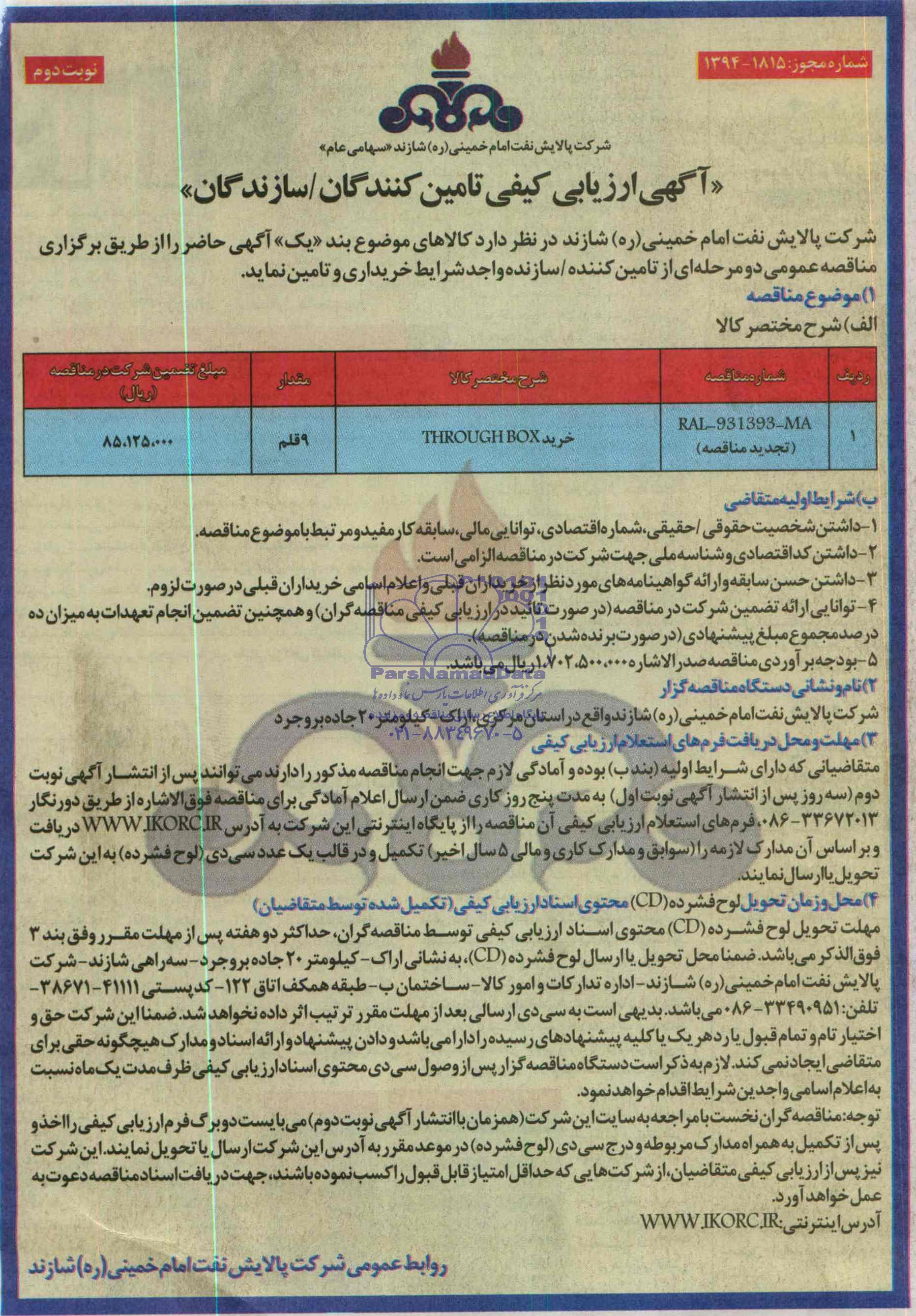 مناقصه خرید THROUGH BOX , آگهی ارزیابی کیفی تولیدکنندگان , مناقصه خرید THROUGH BOX