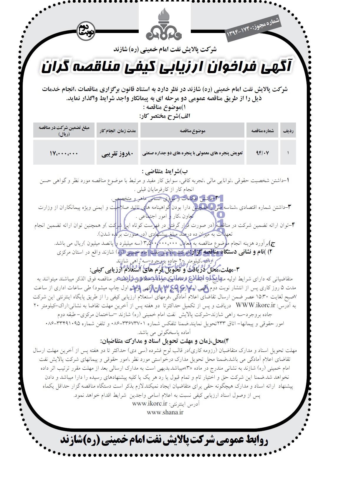 | 94/07 | تعویض پنجره های معمولی با پنجره های دو جداره صنعتی | 80 روز تقویمی | 17.000.000 |