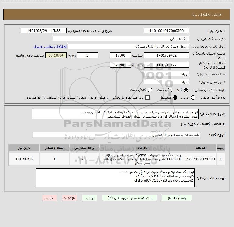 شرح کلی نیاز: تهیه و نصب چادر و افزایش طول سالن بدنسازی فرمانیه طبق قراراداد پیوست.