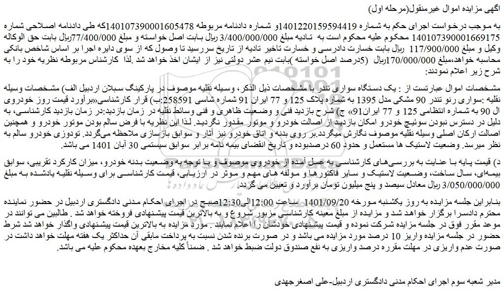 بنابراین جلسه مزایده به روز یکشنبه مورخه 1401/09/20 ساعت 12:00الی12:30صبح در اجرای احکام مدنی دادگستری اردبیل در حضور نماینده محترم دادسرا برگزار خواهد شد و مزایده از مبلغ معینه کارشناسی مزبور شروع و به بالاترین قیمت پیشنهادی فروخته خواهد شد . طالبین می توانند در موعد مقرر فوق در جلسه مزایده شرکت نموده و قیمت پیشنهادی خودشان را اعلام نمایند . مورد مزایده به بالاترین قیمت پیشنهادی واگذار خواهد شد شرط حضور در جلسه مزایده واریز 10 درصد مورد مزایده می باشد و در صورت برنده شدن نسبت به پرداخت مابقی آن حداکثر یک هفته مهلت خواهد داشت در صورت عدم واریزی در مهلت مقرره درصد واریزی به نفع صندوق دولت ضبط خواهد شد . ضمناً کلیه مخارج بعهده محکوم علیه می باشد.