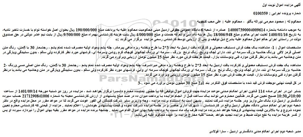 ،به موجب دادنامه بشماره 140007390004009614 صادره از شعبه 6 دادگاه عمومی حقوقی اردبیل مبنی محکومیت محکوم علیه به پرداخت مبلغ 190/000/000 ریال بعنوان اصل خواسته توام با خسارت تاخیر تادیه به تاریخ 1400/01/16 لغایت اجرای حکم و مبلغ 18/006/948 ریال هزینه دادرسی و تعرفه خدمات و مبلغ 4/000/000 ریال بابت هزینه کارشناسی بهمراه مبلغ 9/500/000 ریال از بابت نیم عشر دولتی در حق صندوق دولت در راستای اجرای حکم اموال محکوم علیه بشرح ذیل توقیف و پس از ارزیابی توسط کارشناس رسمی مزایده برگزار می گردد :»