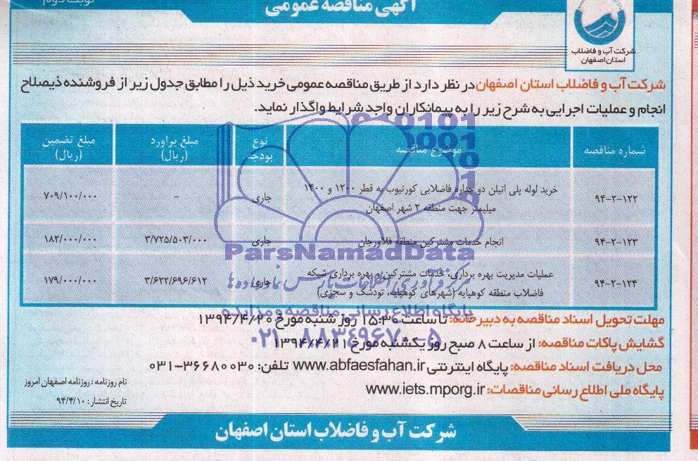 شرکت آب و فاضلاب استان اصفهان در نظر دارد از طریق مناقصه عمومی خرید ذیل را مطابق جدول زیر از فروشندگان انجام و عملیات اجرایی به شرح زیر را به پیمانکاران واجد شرایط واگذار نماید.