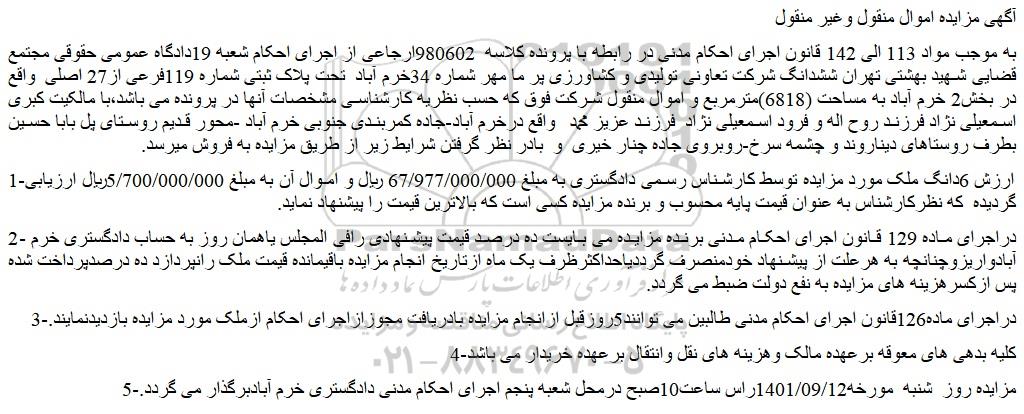 به موجب مواد 113 الی 142 قانون اجرای احکام مدنی در رابطه با پرونده کلاسه  980602ارجاعی از اجرای احکام شعبه 19دادگاه عمومی حقوقی مجتمع قضایی شهید بهشتی تهران ششدانگ شرکت تعاونی تولیدی و کشاورزی پر ما مهر شماره 34خرم آباد  تحت پلاک ثبتی شماره 119فرعی از27 اصلی  واقع در بخش2 خرم آباد به مساحت (6818)مترمربع و اموال منقول شرکت فوق که حسب نظریه کارشناسی مشخصات آنها در پرونده می باشد،با مالکیت کبری اسمعیلی نژاد فرزند روح اله و فرود اسمعیلی نژاد  فرزند عزیز محمد   واقع درخرم آباد-جاده کمربندی جنوبی خرم آباد -محور قدیم روستای پل بابا حسین بطرف روستاهای دیناروند و چشمه سرخ-روبروی جاده چنار خیری  و  بادر نظر گرفتن شرایط زیر از طریق مزایده به فروش میرسد.
