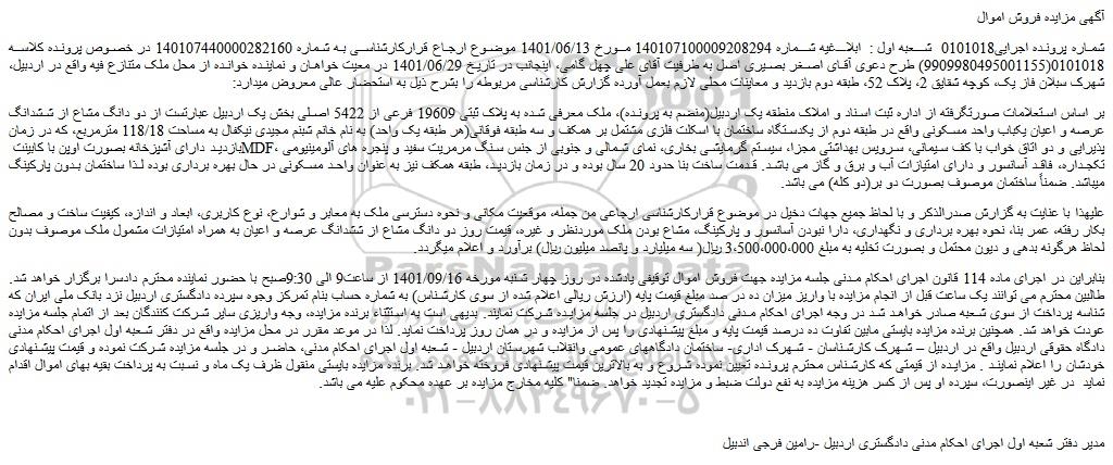 شماره پرونده اجرایی0101018 شعبه اول : ابلاغیه شماره 140107100009208294 مورخ 1401/06/13 موضوع ارجاع قرارکارشناسی به شماره 140107440000282160 در خصوص پرونده کلاسه 0101018(9909980495001155) طرح دعوی آقای اصغر بصیری اصل به طرفیت آقای علی چهل گامی، اینجانب در تاریخ 1401/06/29 در معیت خواهان و نماینده خوانده از محل ملک متنازع فیه واقع در اردبیل، شهرک سبلان فاز یک، کوچه شقایق 2، پلاک 52، طبقه دوم بازدید و معاینات محلی لازم بعمل آورده گزارش کارشناسی مربوطه را بشرح ذیل به استحضار عالی معروض میدارد: