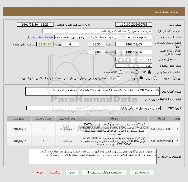 شرح کلی نیاز: کولر دو تیکه 60 و 30 هزار- کد کالا مشابه می باشد، کالا طبق شرح ومشخصات پیوست