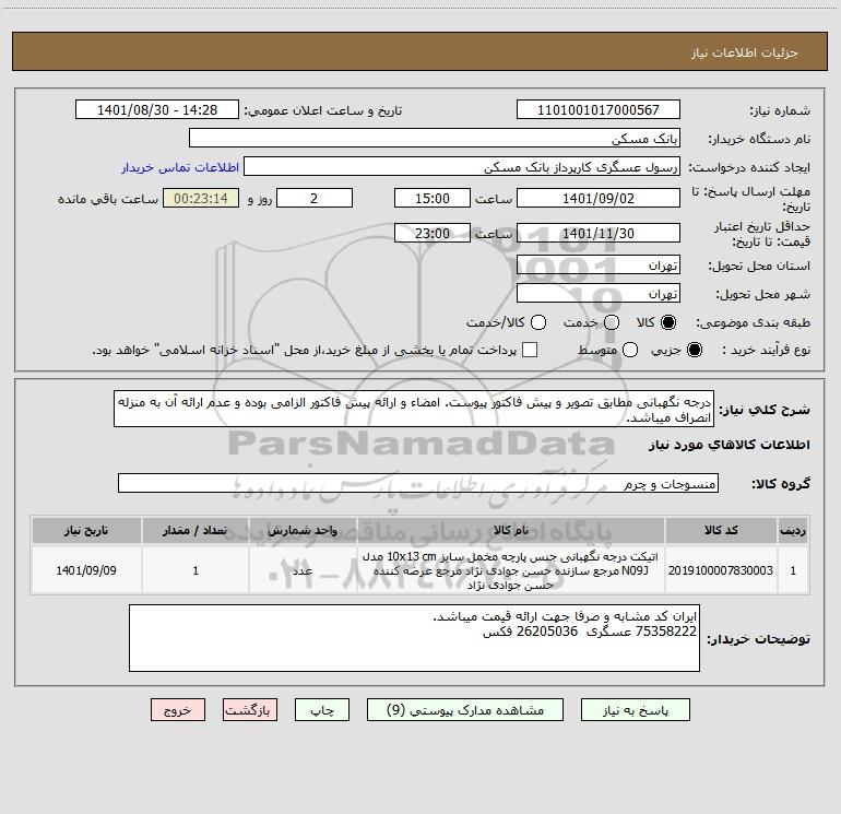 استعلام بها و موضوع استعلام استعلام درجه نگهبانی مطابق تصویر و پیش فاکتور پیوست. امضاء و ارائه پیش فاکتور الزامی بوده و عدم ارائه آن به منزله انصراف میباشد. به اطلاع کلیه شرکت‌ها و افراد متخصص واجد شرایط می‌رساند، آگهی گذار در نظر دارد از طریق استعلام بها، نسبت به انتخاب و دریافت پیشنهادات اقدام نماید. این استعلام با کد آگهی ثبت شده در سامانه خبرگزاری پارس نماد : 5178275 منتشر شده است. مشخصات استعلام : تاریخ شروع استعلام: 1401/08/30 آخرین مهلت ارسال پیشنهاد قیمت : 1401/09/02 و محل اجرای پروژه : استان تهران میباشد. استعلام قیمت مورد درخواست : استعلام درجه نگهبانی مطابق تصویر و پیش فاکتور پیوست. امضاء و ارائه پیش فاکتور الزامی بوده و عدم ارائه آن به منزله انصراف میباشد. با دسته‌بندی‌های تخصصی و گروه های مرتبط : البسه و پوشاک, طراحی چاپ و تبلیغات, استعلام اطلاع رسانی میگردد. شرایط شرکت در استعلام آنلاین : ابتدا ثبت نام در سامانه استعلام پارس نماد و تکمیل مدارک موردنیاز و بارگذاری در سامانه رعایت تمامی ضوابط و الزامات مندرج در اسناد استعلام است.