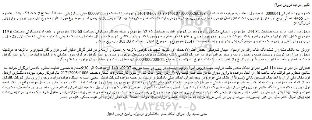 شماره پرونده اجرایی0000941 شعبه اول :عطف به مرقومه نامه شماره 140107100005260298مورخه 1401/04/07 و پرونده کلاسه بشماره 0000941 مبنی بر ارزیابی سه دانگ مشاع از ششدانگ پلاک بشماره ثبتی 4466 اصلی واقع در بخش 1 اردبیل بمالکیت آقای فعال قیومی به نشانی- اردبیل- میدان شریعتی- آیت الاه خامنه ای- کوچه شهید محمد کریمی بازدید بعمل آمد و موضوع مورد نظر به شرح ذیل مورد بررسی وارزیابی قرارگرفت: