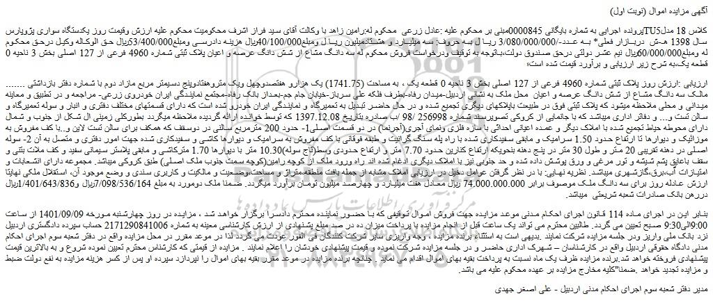 پرونده اجرایی به شماره بایگانی 0000845مبنی بر محکوم علیه :عادل زرعی محکوم له:رامین زاهد با وکالت آقای سید فراز اشرف محکومیت محکوم علیه ارزش وقیمت روز یکدستگاه سواری پژوپارسTU5کلاس 18 مدل سال 1398 هـ-ش دربازار فعلی* به عدد-/3/080/000/000 ریا ل به حروف: سه میلیارد و هشتادمیلیون ریا ل ومبلغ40/100/000ریال هزینه دادرسی ومبلغ53/400/000ریال حق الوکاله وکیل درحق محکوم له ومبلغ60/000/000ریال نیم عشر دولتی درحق صندوق دولت،باتوجه به توقیف ودرخواست فروش محکوم له سه دانگ مشاع از شش دانگ عرصه و اعیان پلاک ثبتی شماره 4960 فرعی از 127 اصلی بخش 3 ناحیه 0 قطعه یک،به شرح زیر ارزیابی و برآورد قیمت شده است؛