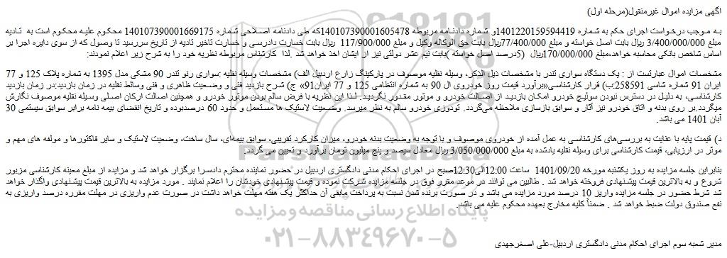 بنابراین جلسه مزایده به روز یکشنبه مورخه 1401/09/20 ساعت 12:00الی12:30صبح در اجرای احکام مدنی دادگستری اردبیل در حضور نماینده محترم دادسرا برگزار خواهد شد و مزایده از مبلغ معینه کارشناسی مزبور شروع و به بالاترین قیمت پیشنهادی فروخته خواهد شد . طالبین می توانند در موعد مقرر فوق در جلسه مزایده شرکت نموده و قیمت پیشنهادی خودشان را اعلام نمایند . مورد مزایده به بالاترین قیمت پیشنهادی واگذار خواهد شد شرط حضور در جلسه مزایده واریز 10 درصد مورد مزایده می باشد و در صورت برنده شدن نسبت به پرداخت مابقی آن حداکثر یک هفته مهلت خواهد داشت در صورت عدم واریزی در مهلت مقرره درصد واریزی به نفع صندوق دولت ضبط خواهد شد . ضمناً کلیه مخارج بعهده محکوم علیه می باشد.