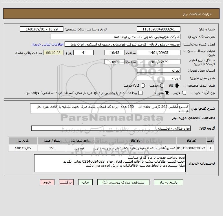 شرح کلی نیاز: کنسرو آناناس 565 گرمی حلقه ای - 150 عدد- ایران کد انتخاب شده صرفا جهت تشابه با کالای مورد نظر میباشد