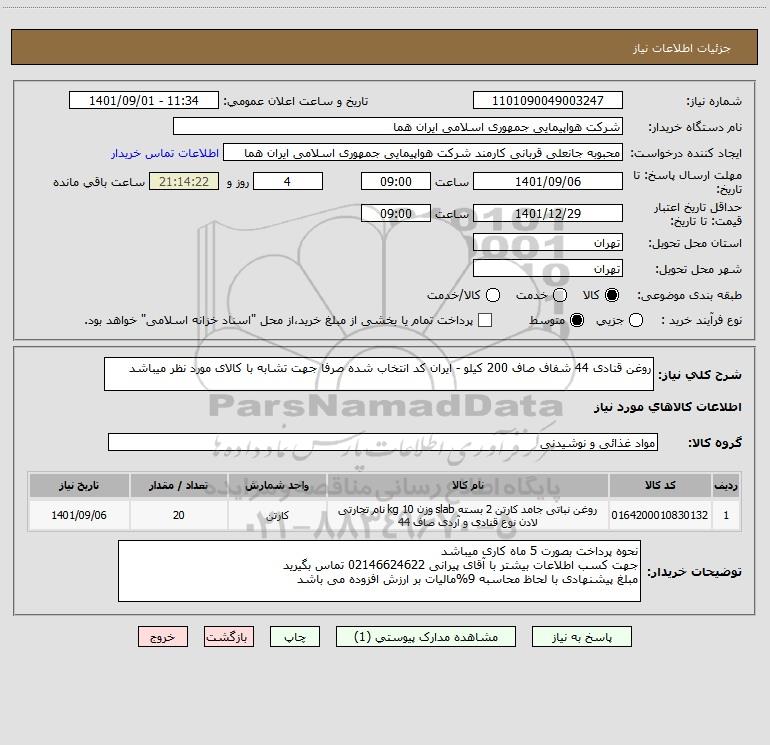 شرح کلی نیاز: روغن قنادی 44 شفاف صاف 200 کیلو - ایران کد انتخاب شده صرفا جهت تشابه با کالای مورد نظر میباشد
