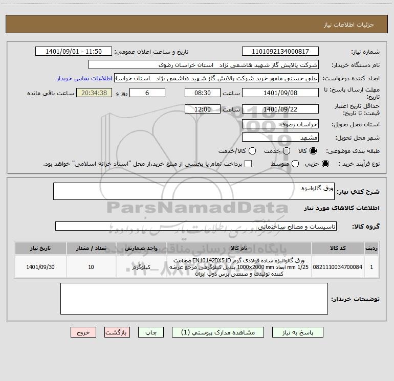 نام دستگاه خریدار:شرکت پالایش گاز شهید هاشمی نژاد استان خراسان رضوی