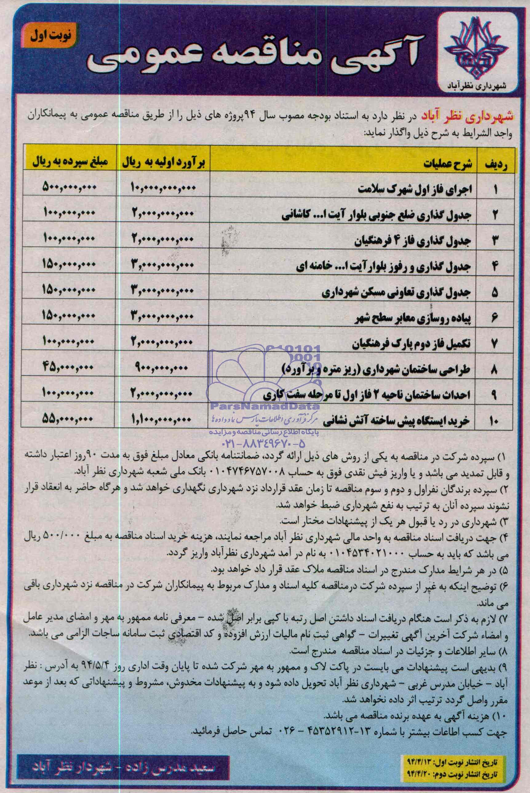 شهرداری نظرآباد در نظ ردارد به استناد بودجه مصوب سال 94، پروژه های ذیل را از طریق مناقصه عمومی به پیمانکاران واجدالشرایط به شرح جدول ذیل واگذار نماید.