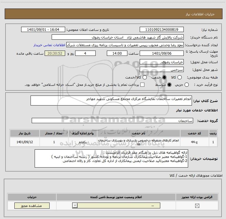 شرح کلی نیاز: انجام تعمیرات ساختمان نمایشگاه مرکزی مجتمع مسکونی شهید مهاجر
