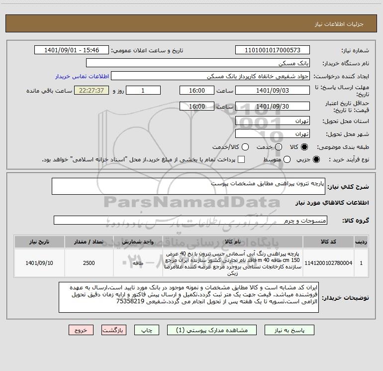 شرح کلی نیاز: پارچه تترون پیراهنی مطابق مشخصات پیوست