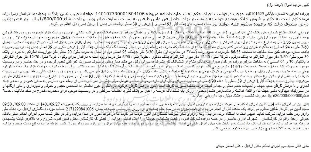 پرونده اجرایی به شماره بایگانی 0101629به موجب درخواست اجرای حکم به شماره دادنامه مربوطه 140107390001504106 خواهان:حبیب غنی زادگان وخوانده: ذوالفقار رسول زاده فردمحکوم است به حکم بر فروش املاک موضوع خواسته و تقسیم بهای حاصل فی مابین طرفین به نسبت تساوی صادر وونیز پرداخت مبلغ 1/800/000ریال نیم عشردولتی درحق صندوق دولت که برعهده محکوم علیه خواهد بود مشاع بشماره های پلاک ثبتی 93 اصلی و 1 فرعی از 39 اصلی واقعات در بخش 1 اردبیل بشرح ذیل اعلام می گردد.