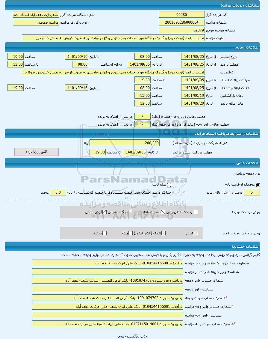 | توضیحات | تجدید مزایده (نوبت دوم) واگذاری جایگاه مورد احداث پمپ بنزین واقع در ویلاشهربه صورت فروش به بخش خصوصی صرفا با امتیاز و احداث پمپ بنزین شهرداری منطقه سه نجف آباد | ||||||