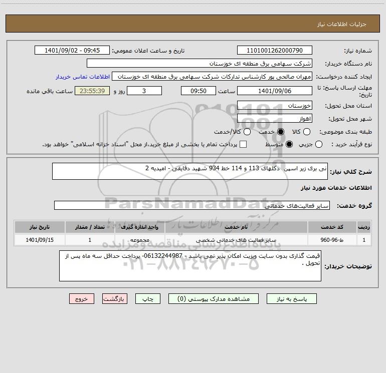 شرح کلی نیاز: نی بری زیر اسپن دکلهای 113 و 114 خط 934 شهید دقایقی - امیدیه 2