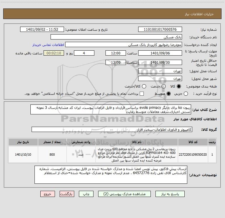 استعلام ریبون ko برای چاپگر evolis primacy براساس قرارداد و فایل الزامات پیوست. ایران کد مشابه.ارسال 3 نمونه تستی اجباری.سقف معاملات متوسط رعایت, استعلام ریبون ko برای چاپگر evolis primacy براساس قرارداد و فایل الزامات پیوست. ایران کد مشابه.ارسال 3 نمونه تستی اجباری.سقف معاملات متوسط رعایت