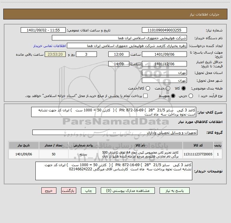 شرح کلی نیاز: کاغذ 3 کپی سایز 21/5 *28 ) PN: 872-16-69 ) ( کارتن 50 = 1000 ست ) ایران کد جهت تشابه است نحوه پرداخت سه ماه است