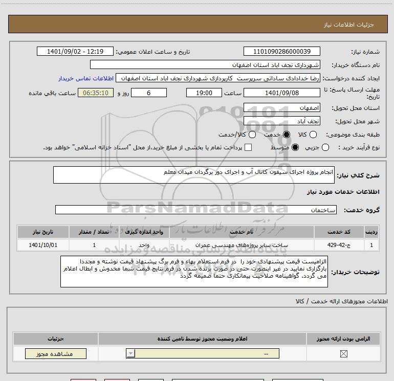 شرح کلی نیاز: انجام پروژه اجرای سیفون کانال آب و اجرای دور برگردان میدان معلم