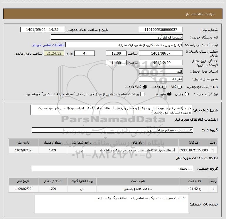 شرح کلی نیاز: خرید (تامین قیر برعهدذه شهرداری ) و حمل و پخش آسفالت و اجرای قیر امولیسیون(تامین قیر امولیسیون برعهده پیمانکار می باشد )