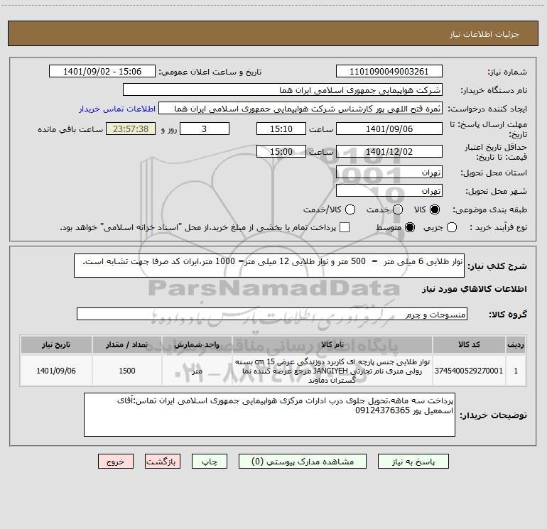 شرح کلی نیاز: نوار طلایی 6 میلی متر = 500 متر و نوار طلایی 12 میلی متر= 1000 متر،ایران کد صرفا جهت تشابه است.