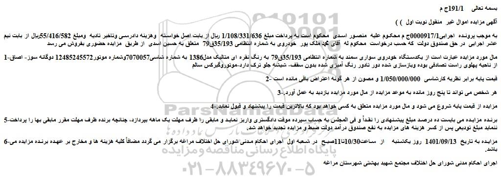 به موجب پرونده اجرایی0000917/1ج م محکوم علیه منصور اسدی محکوم است به پرداخت مبلغ 1/108/331/636 ریال از بابت اصل خواسته وهزینه دادرسی وتاخیر تادیه ومبلغ 55/416/582ریال از بابت نیم عشر اجرایی در حق صندوق دولت که حسب درخواست محکوم له آقای محمد ملک پور خودروی به شماره انتظامی 35/193ق79 متعلق به حسین اسدی از طریق مزایده حضوری بفروش می رسد