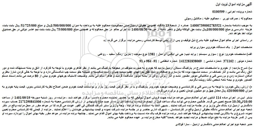 بنابر این در اجرای ماده 114 قانون اجرای احکام مدنی موعد مزایده جهت فروش اموال توقیفی که با حضور نماینده محترم دادسرا برگزار خواهد شد ، مزایده در روز شنبه مورخه 1401/09/19 از ساعت 10:00الی10:30 صبح تعیین می گردد. طالبین محترم می تواند یک ساعت قبل از انجام مزایده با پرداخت میزان ده در صد مبلغ پشنهادی از ارزش کارشناسی معینه به شماره 2171290841006 حساب سپرده دادگستری اردبیل نزد بانک ملی واریز و در جلسه مزایده شرکت نمایند . بدیهی است به استثناء برنده مزایده ، وجه واریزی سایر شرکت کنندگان فی الفور عودت می گردد لذا در موعد مقرر در محل مزایده واقع در دفتر شعبه دوم اجرای احکام مدنی دادگاه حقوقی اردبیل واقع در کارشناسان – شهرک اداری حاضر و در جلسه مزایده شرکت نموده و قیمت پیشنهادی خودشان را اعلام نمایند . مزایده از قیمتی که کارشناس محترم تعیین نموده شروع و به بالاترین قیمت پیشنهادی فروخته خواهد شد. برنده مزایده ظرف یک ماه نسبت به پرداخت بقیه بهای اموال اقدام می نماید . چنانچه برنده مزایده در موعد مقرر بقیه بهای اموال را نپردازد سپرده او پس از کسر هزینه مزایده به نفع دولت ضبط و مزایده تجدید خواهد .ضمنا"کلیه مخارج مزایده بر عهده محکوم علیه می باشد.