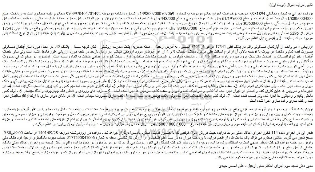 پرونده اجرایی به شماره بایگانی 981894به موجب درخواست اجرای حکم مربوطه به شماره 1398007000507069 و شماره دادنامه مربوطه 9709970404701492 محکوم علیه محکوم است به پرداخت مبلغ 1/800/000/000 ریال بابت اصل خواسته و مبلغ 61/195/000 ریال بابت هزینه دادرسی و مبلغ 348/000 ریال بابت تعرفه خدمات و هزینه اوراق و حق الوکاله وکیل محترم مطابق قرارداد مالی و به تناسب مداخله وکیل محترم در مراحل رسیدگی به مبلغ 39/600/000 ریال و خسارت تاخیر تادیه از تاریخ سررسید چک لغایت اجرای حکم مطابق شاخص اعلامی بانک مرکزی جمهوری اسلامی ایران که قابل محاسبه و پرداخت در زمان اجرای حکم و در واحد محترم اجرای احکام مدنی است در حق محکوم له و مبلغ 90/000/000 ریال به عنوان نیم عشر دولتی در حق صندوق دولت اخذ خواهد شد.دو واحد از آپارتمان مسکونی واقع در پلاک ثبتی 17541 فرعی از 5296 اصلی به آدرس:اردبیل – محله جعفریه- پشت مدرسه روشنی – نبش کوچه صبا - پلاک 42، در محل مورد نظر آپاتمان مسکونی بصورت نیمه تمام و مشتمل بر پیلوت با 6 طبقه بالای آن از نوع اسکلت بتنی موجود میباشد. طبقات 3 و 4بشرح ذیل اعلام می گردد.