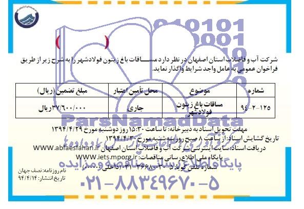 شرکت آب و فاضلاب استان اصفهان در نظر دارد مساقات باغ زیتون فولاد شهر را به شرح زیر از طریق فراخوان عمومی به عامل واجد شرایط واگذار نماید.