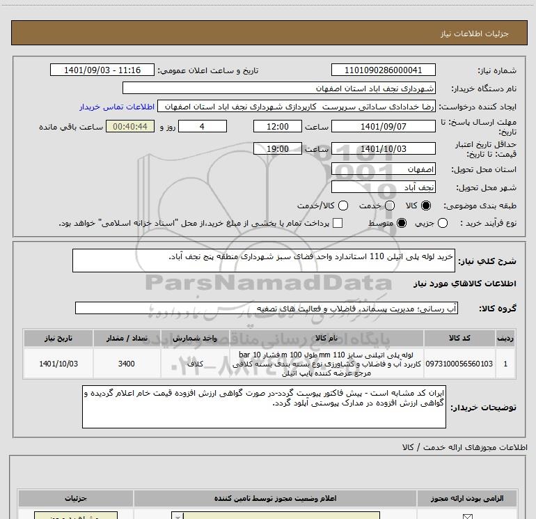 شرح کلی نیاز: خرید لوله پلی اتیلن 110 استاندارد واحد فضای سبز شهرداری منطقه پنج نجف آباد.