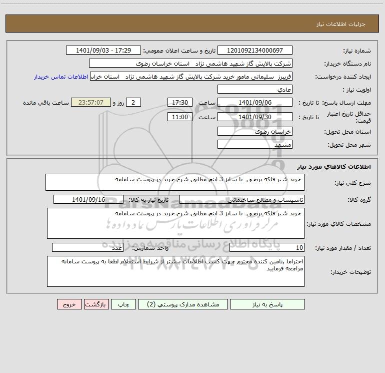 نام دستگاه خریدار:شرکت پالایش گاز شهید هاشمی نژاد استان خراسان رضوی