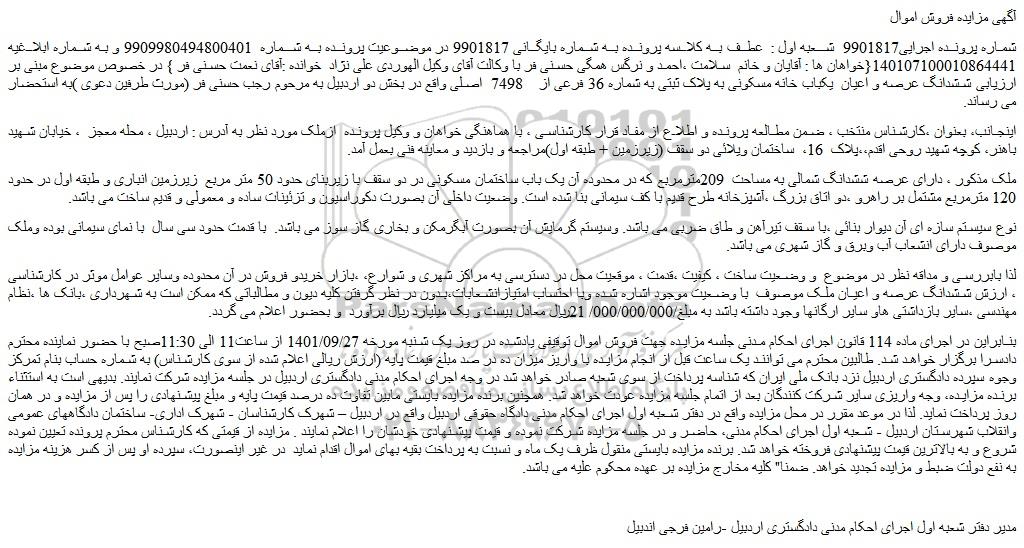 شماره پرونده اجرایی9901817 شعبه اول : عطف به کلاسه پرونده به شماره بایگانی 9901817 در موضوعیت پرونده به شماره 9909980494800401 و به شماره ابلاغیه 140107100010864441{خواهان ها : آقایان و خانم سلامت ،احمد و نرگس همگی حسنی فر با وکالت آقای وکیل الهوردی علی نژاد خوانده :آقای نعمت حسنی فر } در خصوص موضوع مبنی بر ارزیابی ششدانگ عرصه و اعیان یکباب خانه مسکونی به پلاک ثبتی به شماره 36 فرعی از 7498 اصلی واقع در بخش دو اردبیل به مرحوم رجب حسنی فر (مورث طرفین دعوی )به استحضار می رساند.