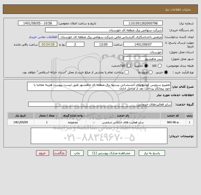 شرح کلی نیاز: تعمیرو سرویس کپسولهای آتشنشانی پستها برق منطقه ای ماهشهر طبق لیست پیوست هزینه مفاصا با خود پیمانکار پرداخت بعد از مراحل اداری