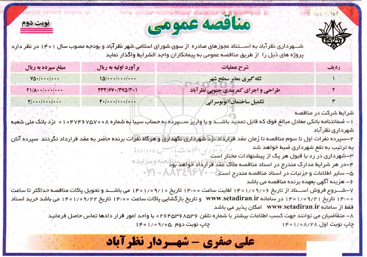 شهرداری نظرآباد به استناد مجوزهای صادره از سوی شورای اسلامی شهر نظرآباد و بودجه مصوب سال 1401 در نظر دارد پروژه های ذیل را از طریق مناقصه عمومی به پیمانکاران واجدالشرایط واگذار نماید.