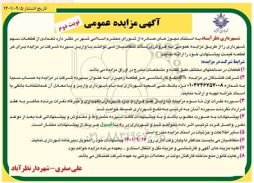 شهرداری نظرآباد در نظر دارد تعدادی از قطعات سهم شهرداری را از طریق مزایده به فروش برساند. متقاضیان می توانند با واریز سپرده شرکت در مزایده برای هر قطعه قیمت پینشهادی خود را ارائه نمایند.
