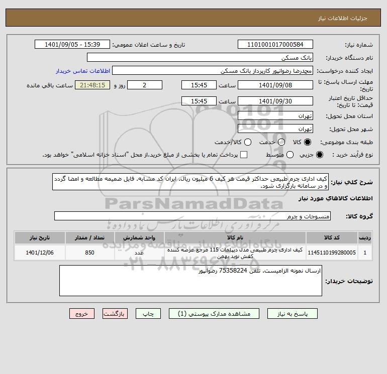 شرح کلی نیاز: کیف اداری چرم طبیعی حداکثر قیمت هر کیف 6 میلیون ریال. ایران کد مشابه. فایل ضمیمه مطالعه و امضا گردد و در سامانه بارگزاری شود.